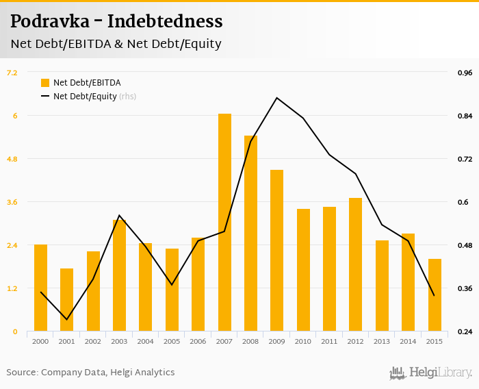 Podravka's net debt stood at HRK 926 mil and accounted for 0.337 of equity at the end of 2015. The ratio is down 0.153 pp compared to the previous year.