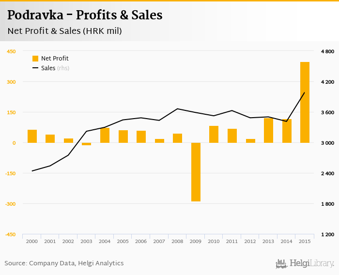 Historically, between 2000 and 2015, the company’s net profit reached a high of HRK 398 mil in 2015 and a low of HRK -288 mil in 2009. Over the last decade the firm's net profit increased by an average of 20.3% a year.