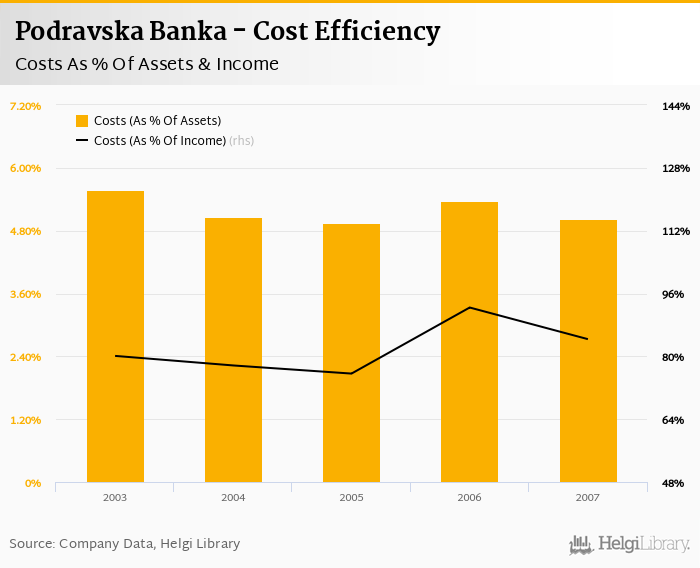 Podravska Banka's cost to income ratio reached 84.4% in 2007, down from 92.4% compared to the previous year.