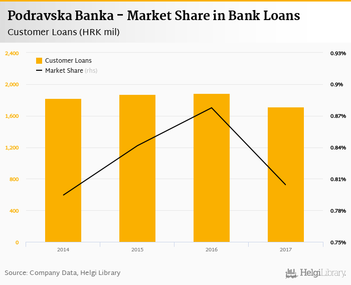 Podravska Banka's customer loans reached HRK 1,713 mil in 2017, down 9.13% compared to the previous year.
