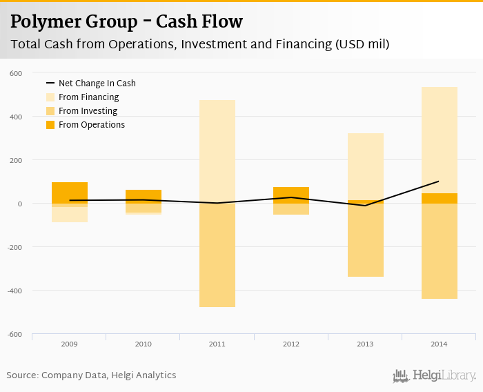 Polymer Group's operating cash flow stood at USD 49.1 mil in 2014, up 192% when compared to the previous year. Historically, between 2009 - 2014, the firm’s operating cash flow reached a high of USD 99.0 mil in 2009 and a low of USD -1.15 mil in 2011.