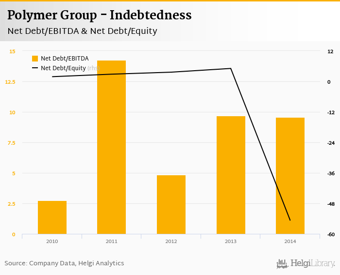 Polymer Group's net debt stood at USD 1,304 mil and accounted for -54.8 of equity at the end of 2014. The ratio is down 59.9 pp compared to the previous year.