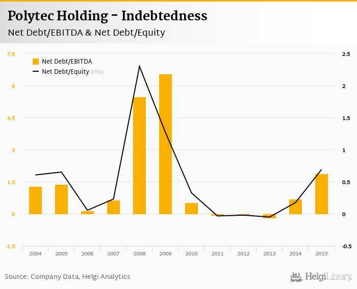 Polytec Holding's net debt stood at EUR 112 mil and accounted for 0.690 of equity at the end of 2015. The ratio is up 0.515 pp compared to the previous year.