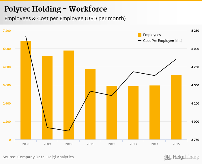 Polytec Holding employed 4,247 employees in 2015, up 18.6% compared to the previous year. Historically, between 2008 and 2015, the firm's workforce hit a high of 6,539 employees in 2008 and a low of 3,516 employees in 2013.