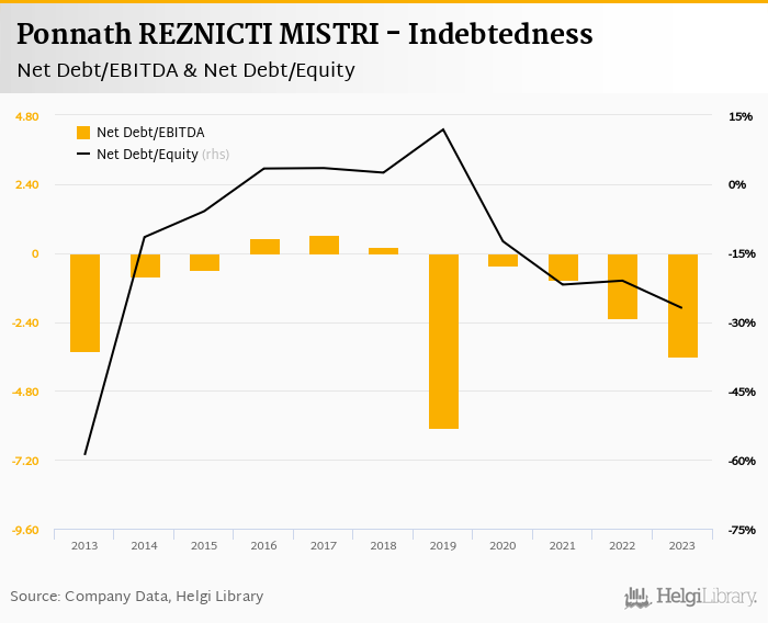 Ponnath REZNICTI MISTRI's net debt stood at CZK -85.1 mil and accounted for -27.0% of equity at the end of 2023. The ratio is down 5.97 pp compared to the previous year.