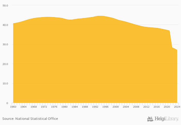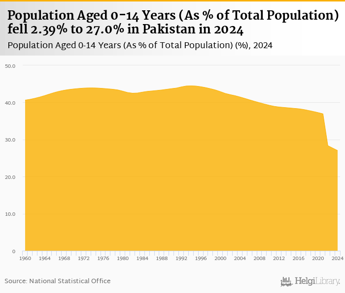 Population aged 0-14 years as a percentage of total population fell 2.39% to 27.0% in Pakistan in 2024, according to the National Statistical Office.