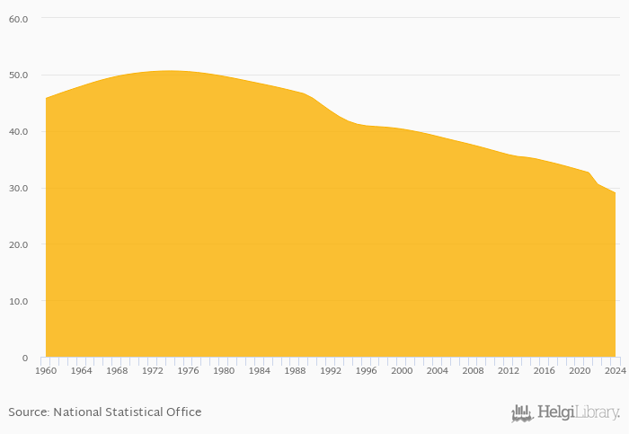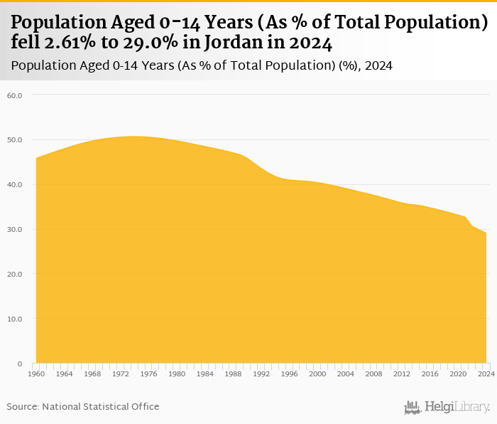 Population aged 0-14 years as a percentage of total population fell 2.61% to 29.0% in Jordan in 2024, according to the National Statistical Office.