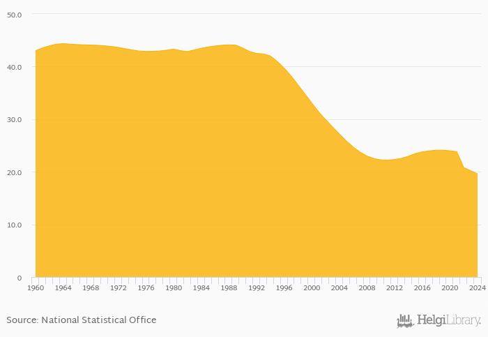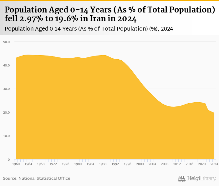 Population aged 0-14 years as a percentage of total population fell 2.97% to 19.6% in Iran in 2024, according to the National Statistical Office.