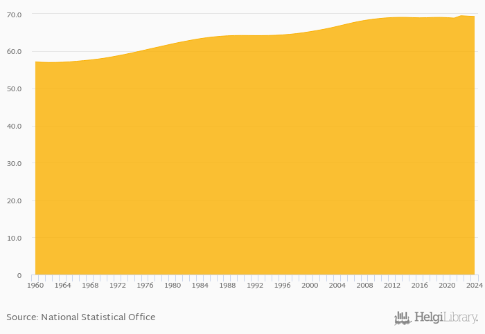 Historically, population aged 15-64 years as a percentage of total population in Chile reached an all time high of 69.5% in 2022 and an all time low of 56.9% in 1962. When compared to Chile's main peers, population aged 15-64 years as a percentage of total population in Argentina amounted to 67.4%, 65.1% in Bolivia, 66.1% in Paraguay and 66.5% in Uruguay in 2024.