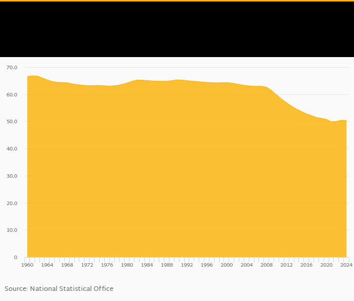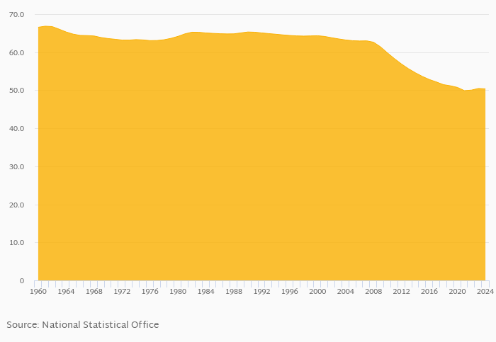 Population aged 15-64 years as a percentage of total population fell 0.204% to 50.4% in Monaco in 2024, according to the National Statistical Office.