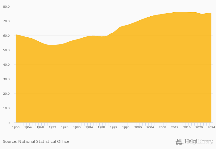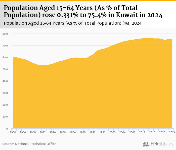 Population aged 15-64 years as a percentage of total population rose 0.331% to 75.4% in Kuwait in 2024, according to the National Statistical Office.