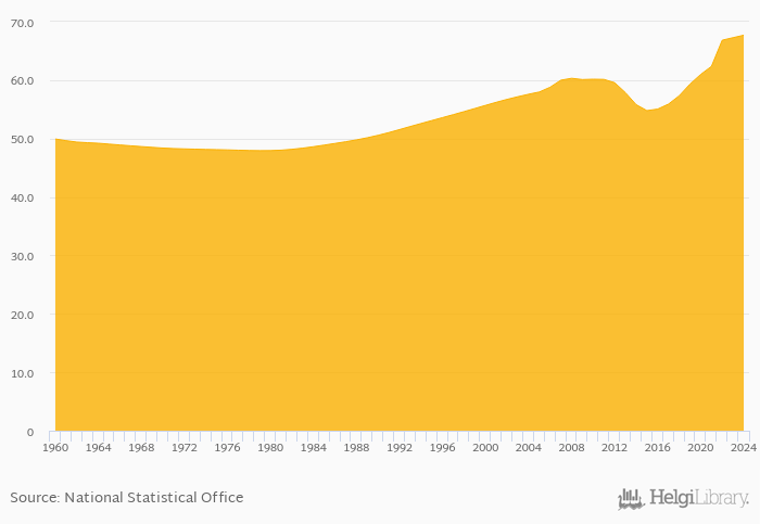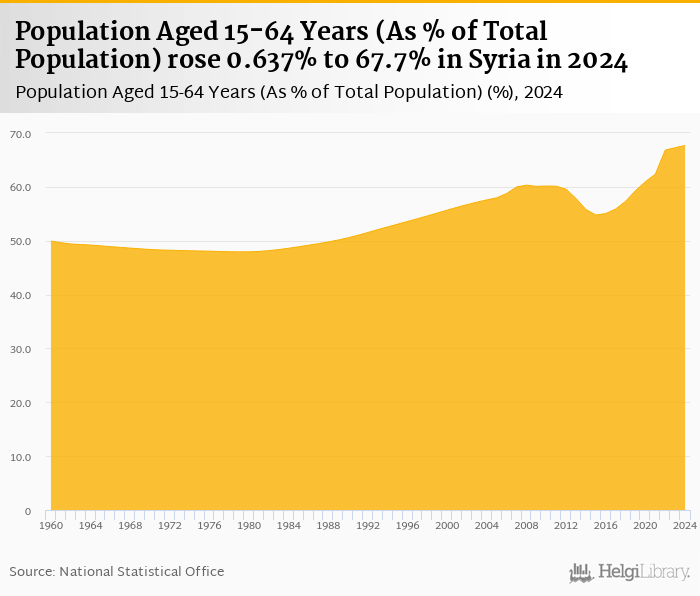 Population aged 15-64 years as a percentage of total population rose 0.637% to 67.7% in Syria in 2024, according to the National Statistical Office.