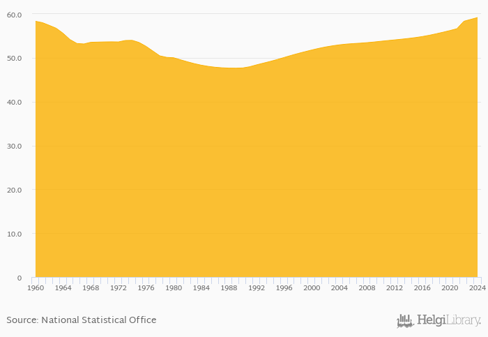 Historically, population aged 15-64 years as a percentage of total population in Guinea Bissau reached an all time high of 59.2% in 2024 and an all time low of 47.6% in 1989. When compared to Guinea Bissau's main peers, population aged 15-64 years as a percentage of total population in Gambia amounted to 55.0%, 59.2% in Guinea, 52.0% in Mali and 57.9% in Senegal in 2024.