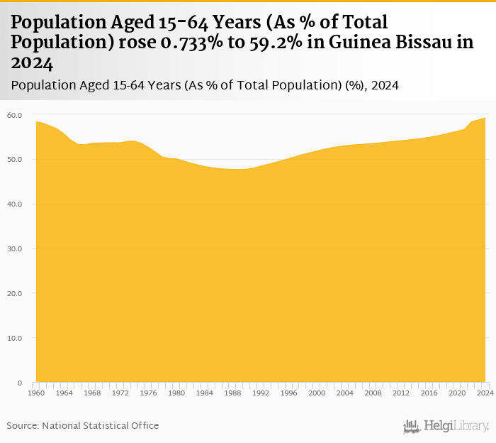 Population aged 15-64 years as a percentage of total population rose 0.733% to 59.2% in Guinea Bissau in 2024, according to the National Statistical Office.