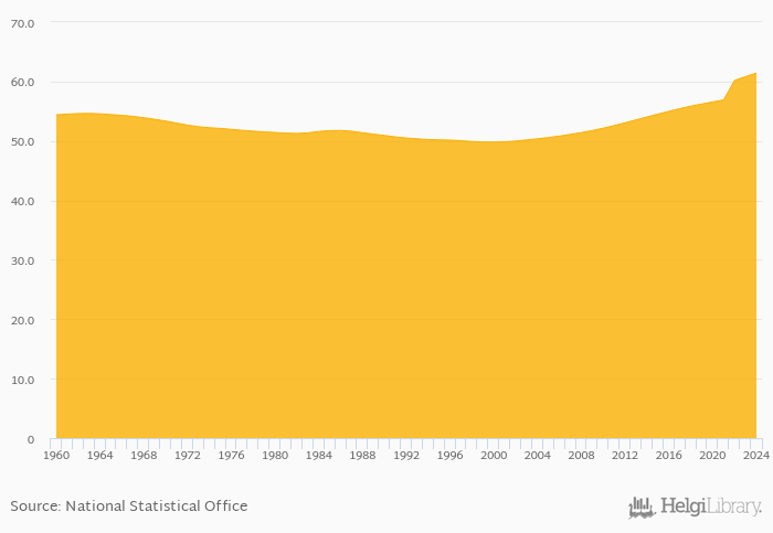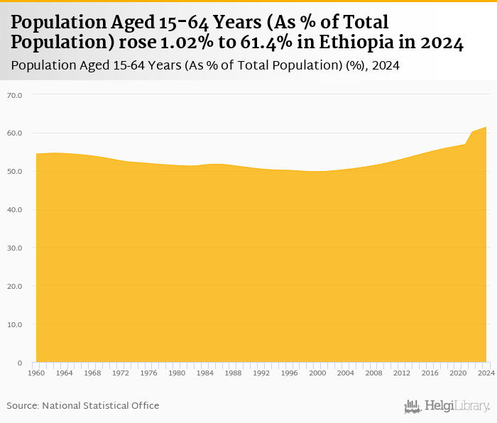 Population aged 15-64 years as a percentage of total population rose 1.02% to 61.4% in Ethiopia in 2024, according to the National Statistical Office.