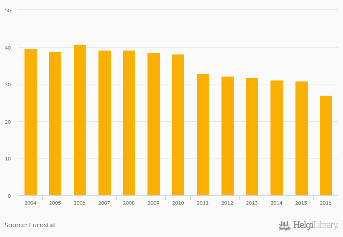 Population by Educational Attainment Level - From 18 to 74 years - Less than primary, primary and lower secondary education (levels 0-2) - Males fell 12.3% to 27.0% in Iceland in 2016, according to Eurostat.