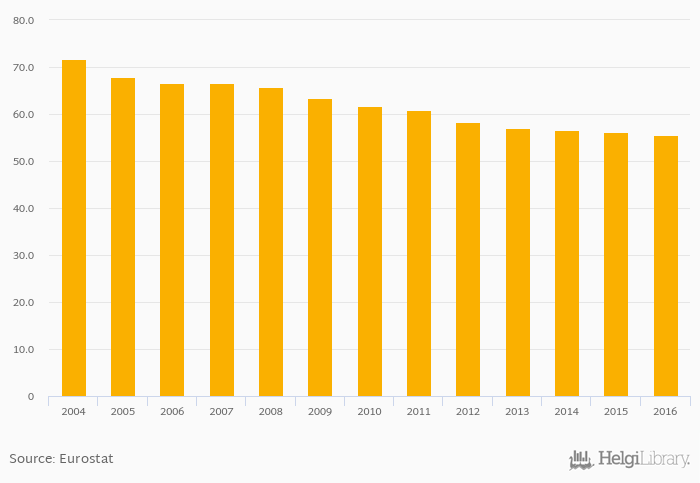 Historically, Population by Educational Attainment Level - From 18 to 74 years - Less than primary, primary and lower secondary education (levels 0-2) - Males in Malta reached an all time high of 71.7% in 2004 and an all time low of 55.5% in 2016.