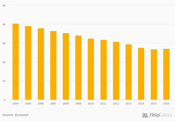 Historically, Population by Educational Attainment Level - From 18 to 74 years - Less than primary, primary and lower secondary education (levels 0-2) - Males in Ireland reached an all time high of 40.4% in 2004 and an all time low of 26.7% in 2015.