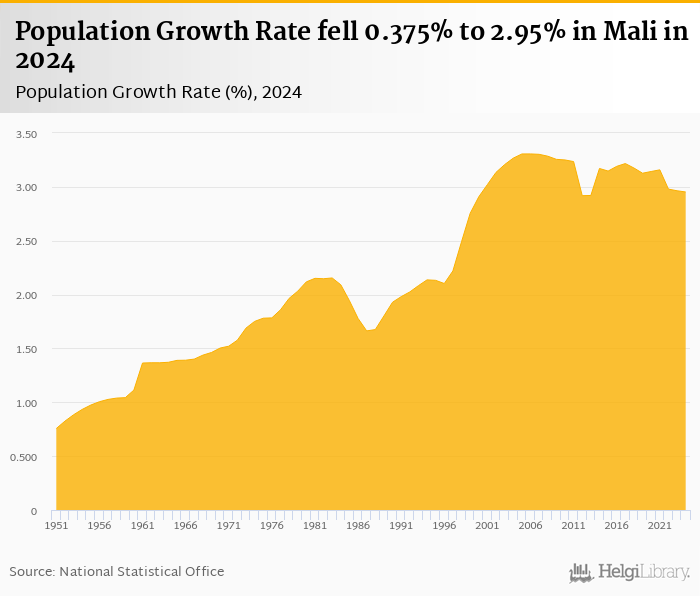 Population growth rate fell 0.375% to 2.95% in Mali in 2024, according to the National Statistical Office.