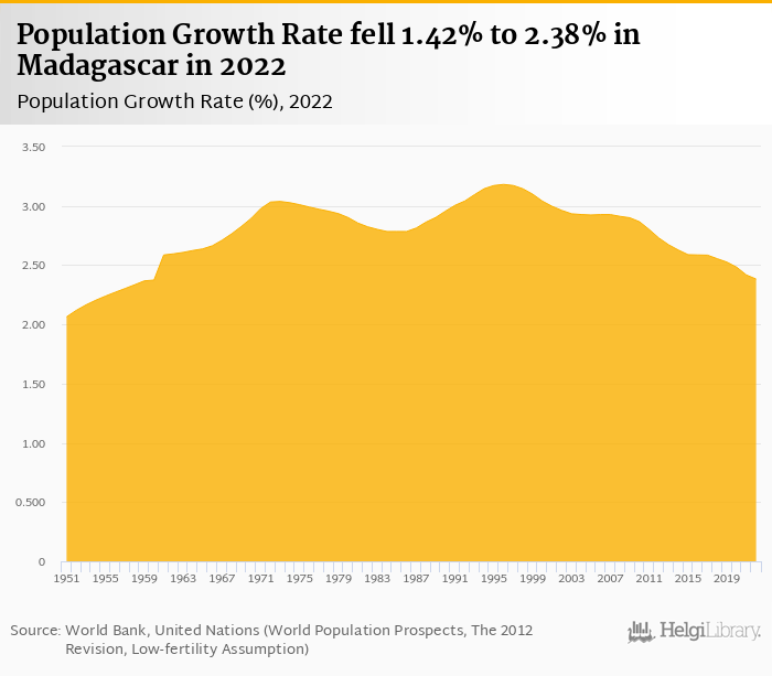 Population growth rate fell 1.42% to 2.38% in Madagascar in 2022, according to the National Statistical Office.