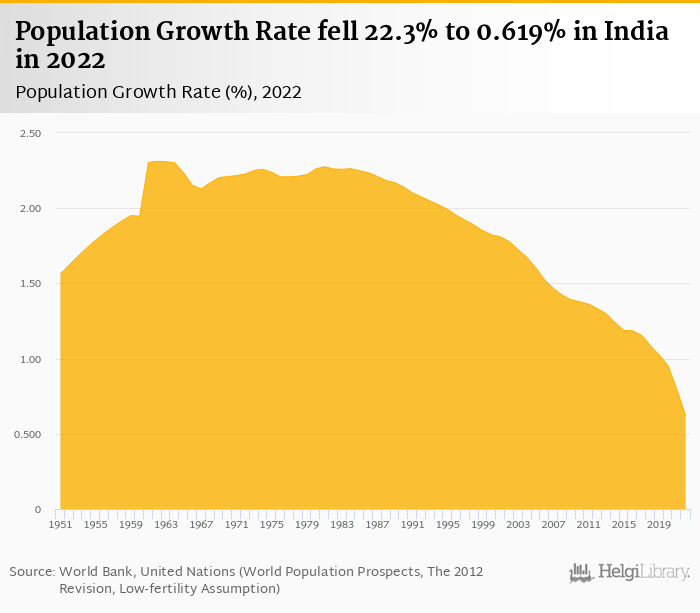 Population growth rate fell 22.3% to 0.619% in India in 2022, according to the National Statistical Office.