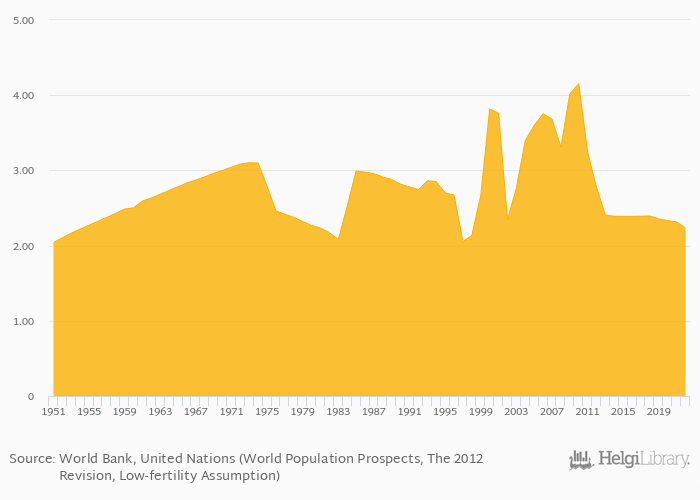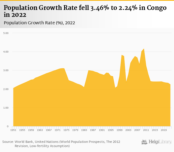 Historically, population growth rate in Congo reached an all time high of 4.16% in 2010 and an all time low of 2.04% in 1951. When compared to Congo's main peers, population growth rate in Cameroon amounted to 2.04%, 1.55% in Central African Republic, 1.76% in Gabon and 2.29% in Dem. Republic of the Congo in 2022.