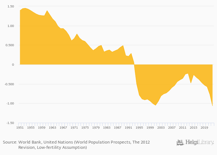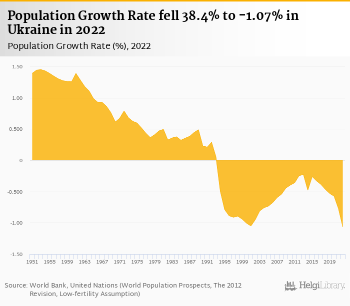 Historically, population growth rate in Ukraine reached an all time high of 1.45% in 1953 and an all time low of -1.07% in 2022. When compared to Ukraine's main peers, population growth rate in Poland amounted to -0.440%, -0.729% in Romania and -0.748% in Russia in 2022.