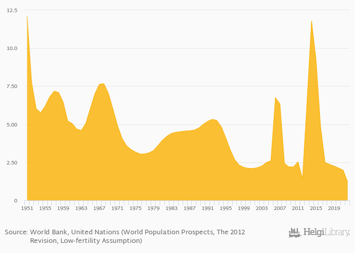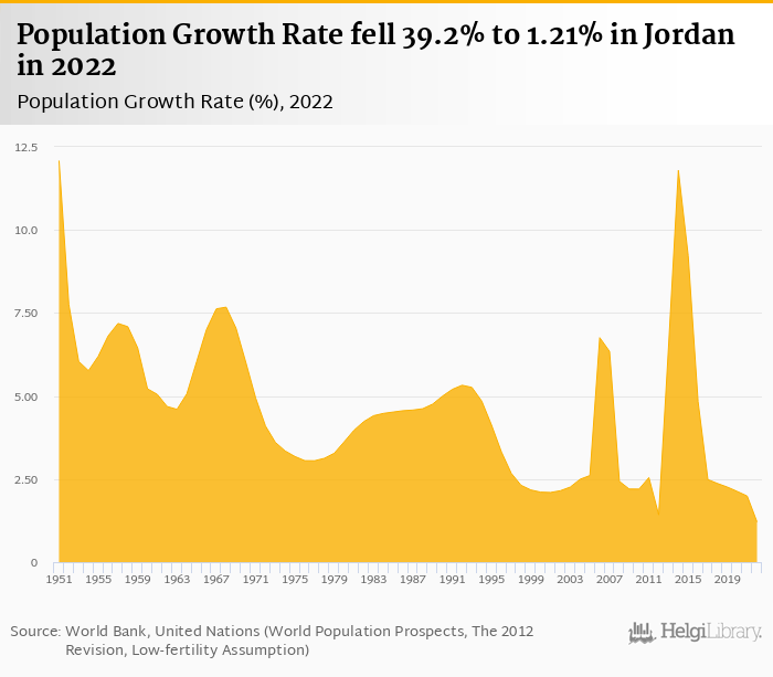 Historically, population growth rate in Jordan reached an all time high of 12.1% in 1951 and an all time low of 1.21% in 2022. When compared to Jordan's main peers, population growth rate in Iraq amounted to 2.16%, 1.01% in Israel, 0.920% in Saudi Arabia and 1.35% in Syria in 2022.