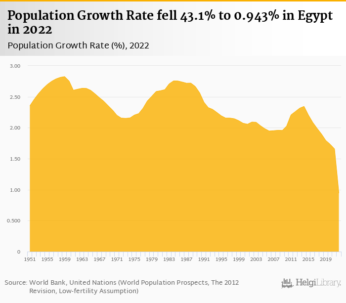 Historically, population growth rate in Egypt reached an all time high of 2.82% in 1959 and an all time low of 0.943% in 2022. When compared to Egypt's main peers, population growth rate in Israel amounted to 1.01%, 0.780% in Libya, 0.920% in Saudi Arabia and 1.94% in Sudan in 2022.