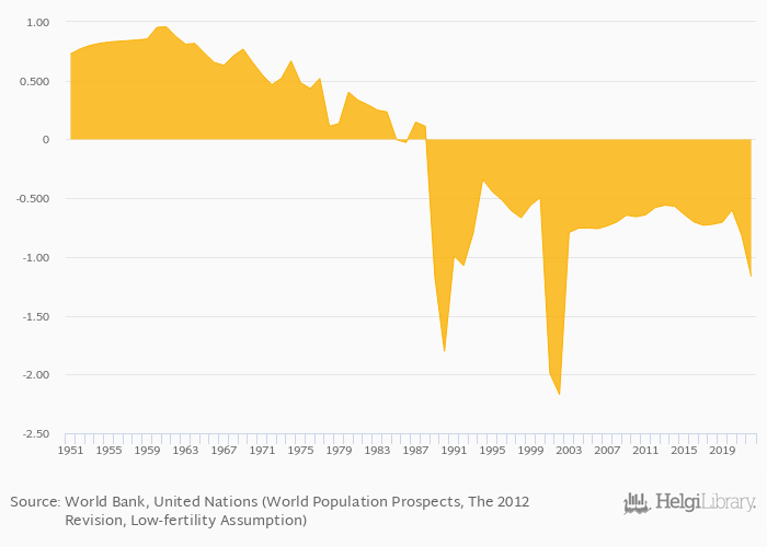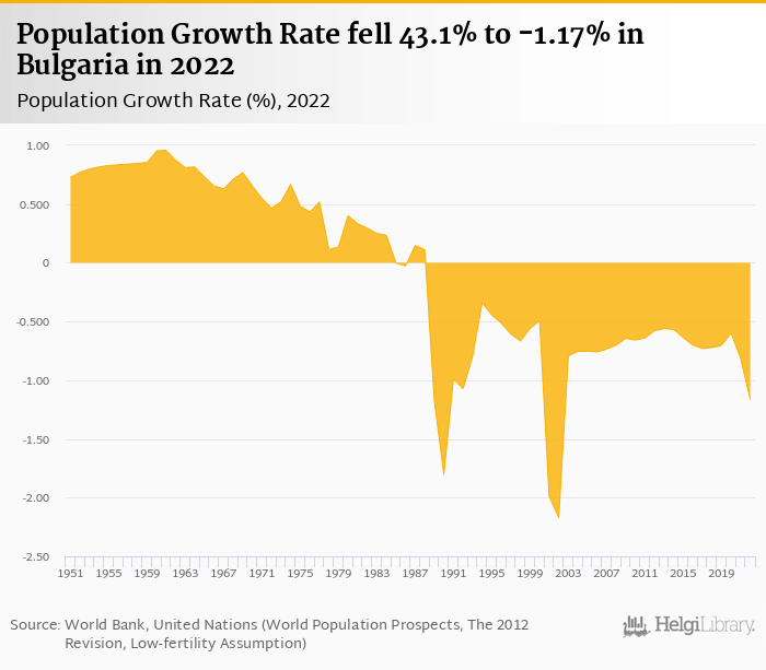 Historically, population growth rate in Bulgaria reached an all time high of 0.958% in 1961 and an all time low of -2.17% in 2002. When compared to Bulgaria's main peers, population growth rate in Greece amounted to -0.348%, -0.729% in Romania, -0.935% in Serbia and 0.489% in Turkey in 2022.