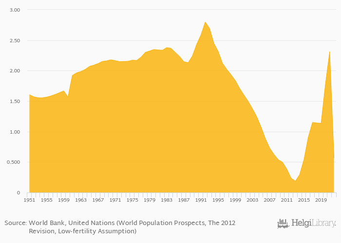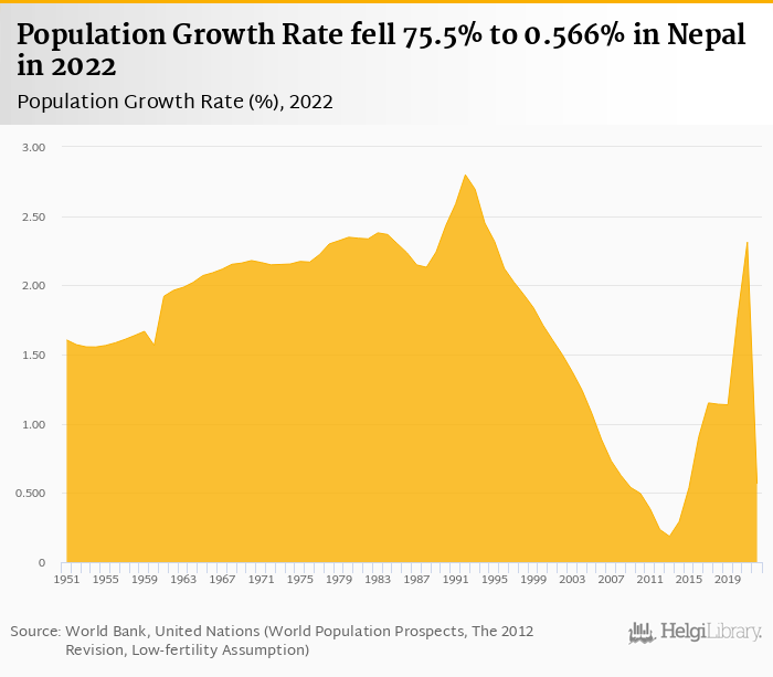 Historically, population growth rate in Nepal reached an all time high of 2.80% in 1992 and an all time low of 0.186% in 2013. When compared to Nepal's main peers, population growth rate in Bangladesh amounted to 0.592%, 0.620% in Bhutan, -0.048% in China and 0.619% in India in 2022.