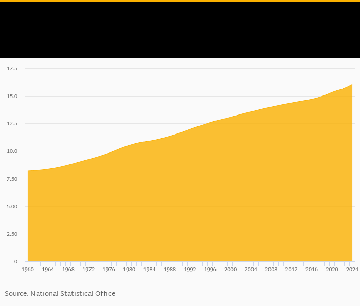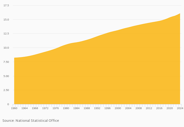Population over 65 years old as a percentage of total population rose 1.47% to 16.0% in Uruguay in 2024, according to the National Statistical Office.