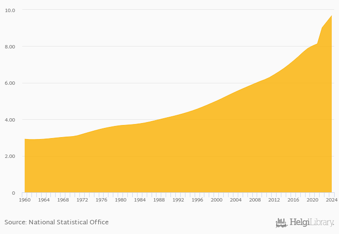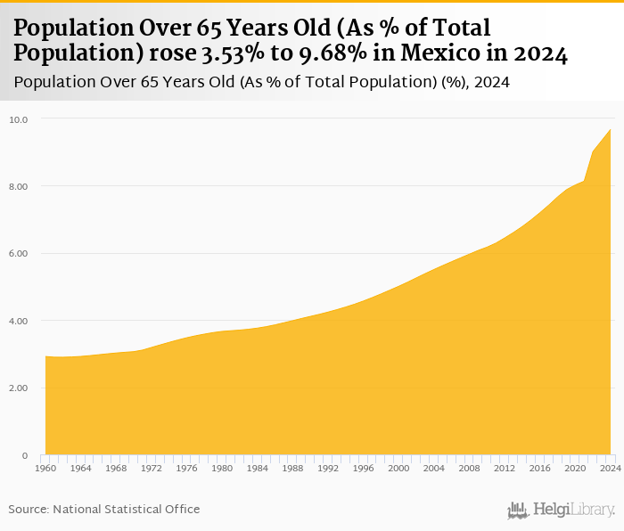 Population over 65 years old as a percentage of total population rose 3.53% to 9.68% in Mexico in 2024, according to the National Statistical Office.