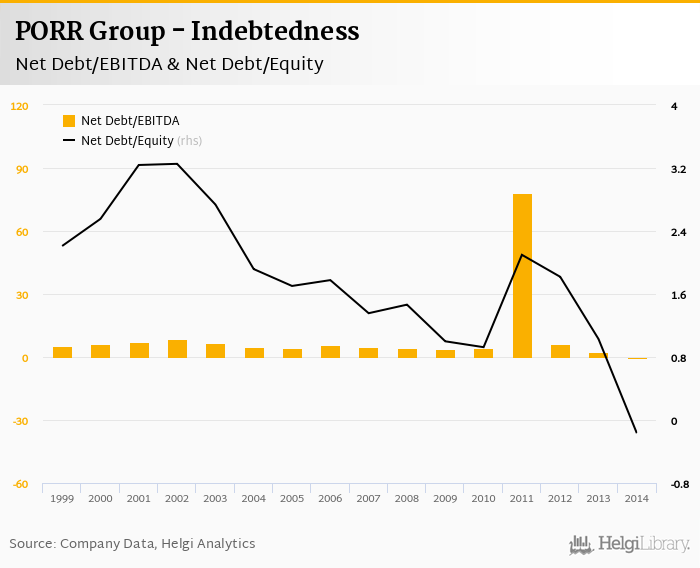 PORR Group's net debt stood at EUR -64.6 mil and accounted for -0.168 of equity at the end of 2014. The ratio is down 1.20 pp compared to the previous year.