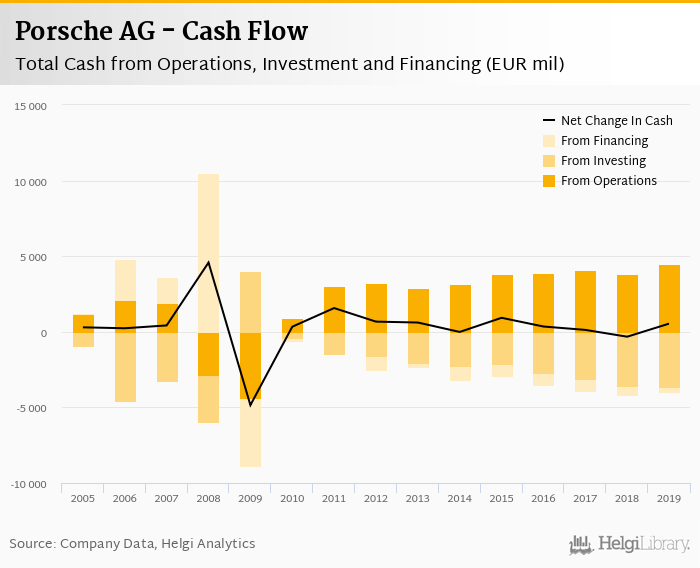 Porsche AG's operating cash flow stood at EUR 4,487 mil in 2019, up 16.7% when compared to the previous year. Historically, between 2005 - 2019, the firm’s operating cash flow reached a high of EUR 4,487 mil in 2019 and a low of EUR -4,378 mil in 2009.