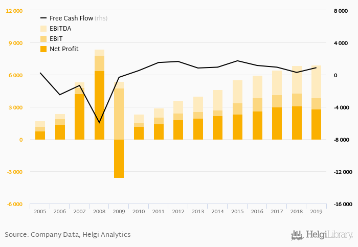 The company generated cash, defined by a sum of net profit and depreciation, of EUR 5,840 mil or 20.5% of sales. When investments are excluded, free cash flow reached EUR 869 mil, or 3.05% of sales in 2019.