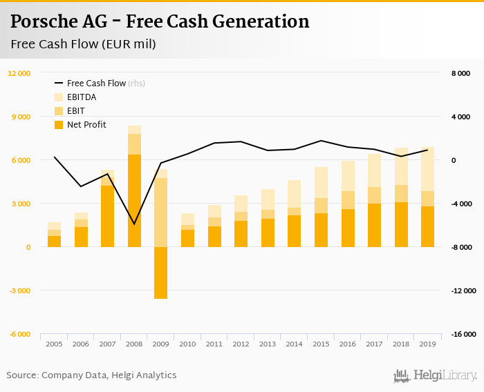 Porsche AG made a net profit of EUR 2,796 mil with revenues of EUR 28,518 mil in 2019, down by 10.2% and up by 10.6%, respectively, compared to the previous year. This translates into a net margin of 9.80%.