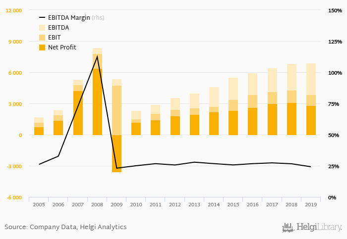 On the operating level, EBITDA reached EUR 6,906 mil, up 0.729% compared to the previous year. Over the last five years, company's EBITDA has risen 8.48% a year on average.