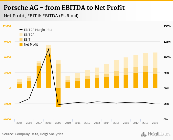 Porsche AG made a net profit of EUR 2,796 mil with revenues of EUR 28,518 mil in 2019, down by 10.2% and up by 10.6%, respectively, compared to the previous year. This translates into a net margin of 9.80%.