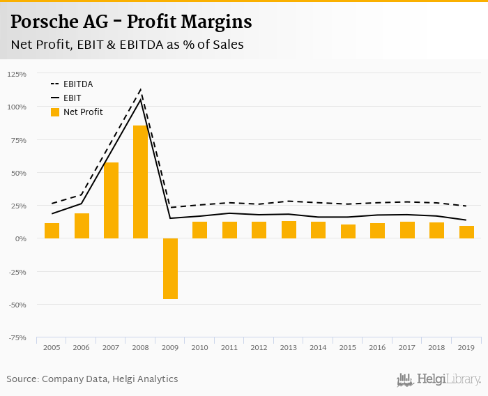 Porsche AG made a net profit of EUR 2,796 mil with revenues of EUR 28,518 mil in 2019, down by 10.2% and up by 10.6%, respectively, compared to the previous year.