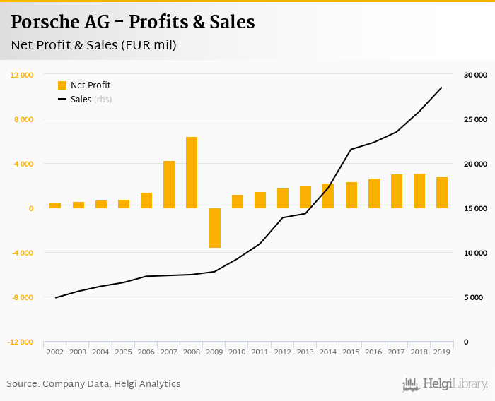 Porsche AG made a net profit of EUR 2,796 mil in 2019, down 10.2% compared to the previous year. Total sales reached EUR 28,518 mil, which is up 10.6% when compared to the previous year.