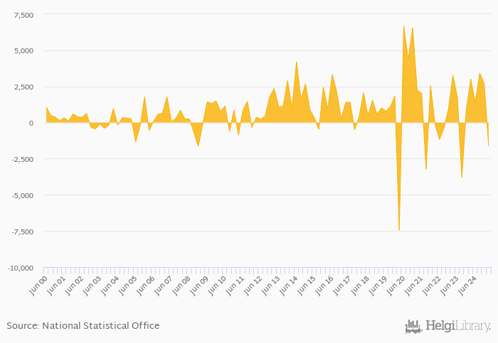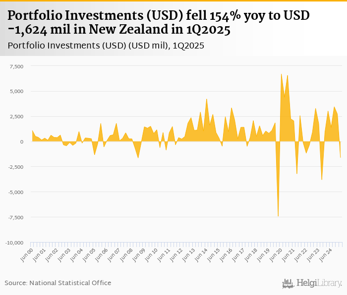 Portfolio investments fell 154% yoy to USD -1,624 mil in New Zealand in 1Q2025, according to the National Statistical Office. This is 160% less than in the previous quarter.