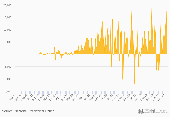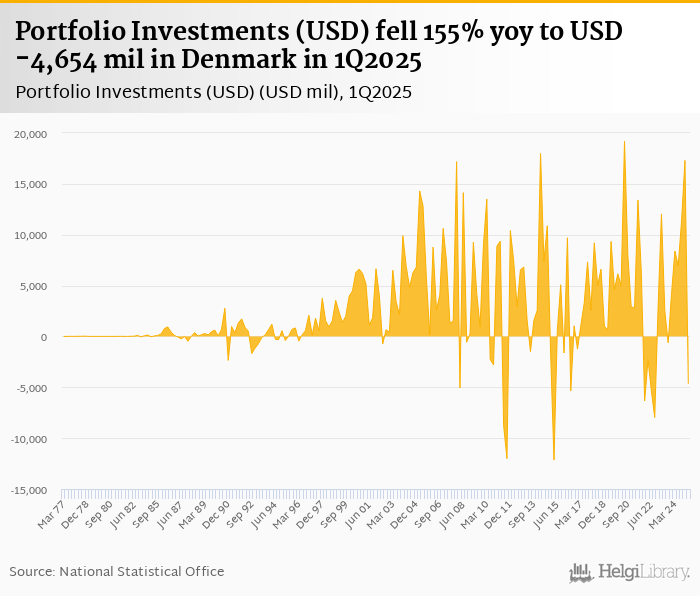 Portfolio investments fell 155% yoy to USD -4,654 mil in Denmark in 1Q2025, according to the National Statistical Office. This is 127% less than in the previous quarter.