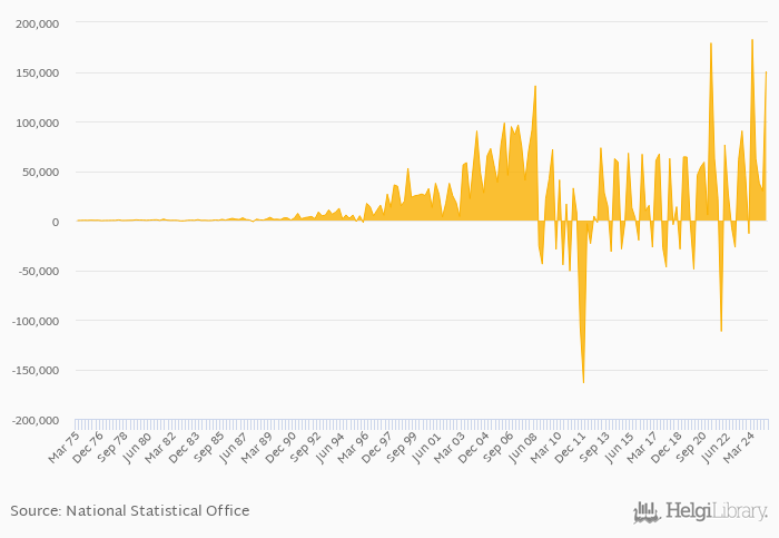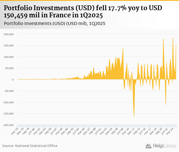 Portfolio investments fell 17.7% yoy to USD 150,459 mil in France in 1Q2025, according to the National Statistical Office. This is 406% more than in the previous quarter.