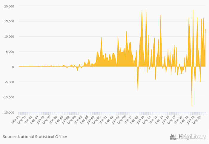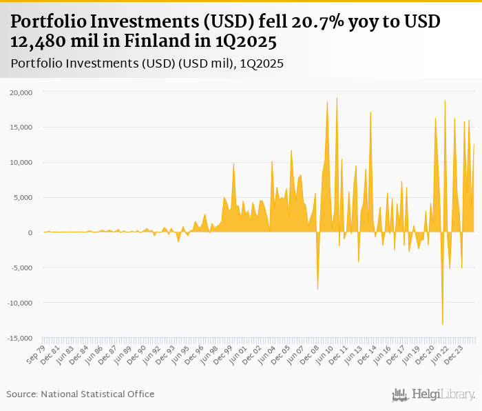 Portfolio investments fell 20.7% yoy to USD 12,480 mil in Finland in 1Q2025, according to the National Statistical Office. This is 271% more than in the previous quarter.
