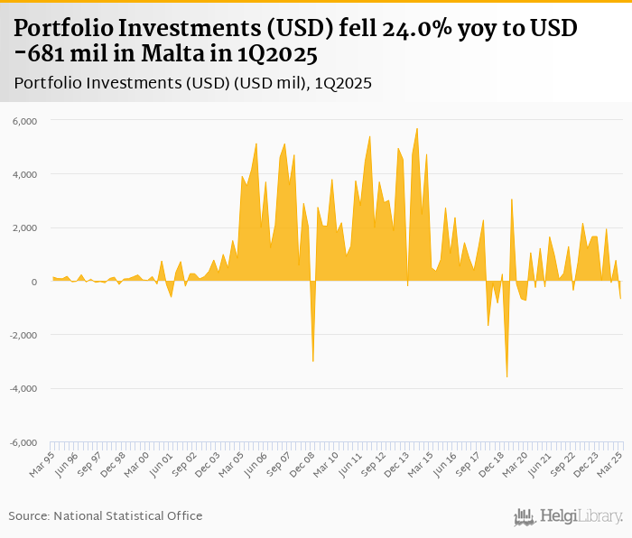 Portfolio investments fell 24.0% yoy to USD -681 mil in Malta in 1Q2025, according to the National Statistical Office. This is 189% less than in the previous quarter.