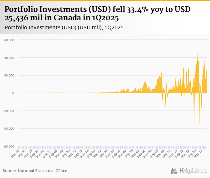 Portfolio investments fell 33.4% yoy to USD 25,436 mil in Canada in 1Q2025, according to the National Statistical Office. This is 90.5% more than in the previous quarter.
