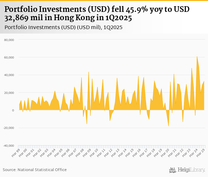Portfolio investments fell 45.9% yoy to USD 32,869 mil in Hong Kong in 1Q2025, according to the National Statistical Office. This is 14.3% more than in the previous quarter.