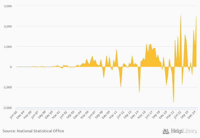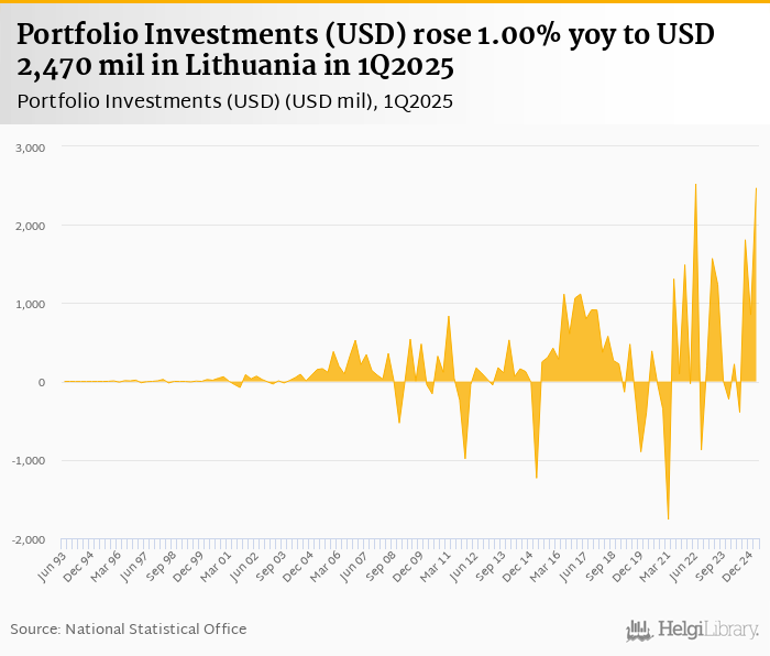 Portfolio investments rose 1.00% yoy to USD 2,470 mil in Lithuania in 1Q2025, according to the National Statistical Office. This is 191% more than in the previous quarter.