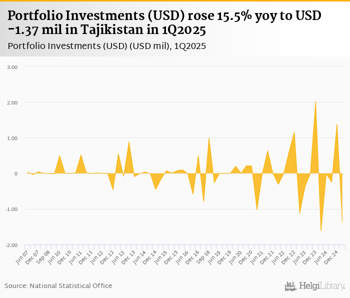 Portfolio investments rose 15.5% yoy to USD -1.37 mil in Tajikistan in 1Q2025, according to the National Statistical Office. This is 199% less than in the previous quarter.